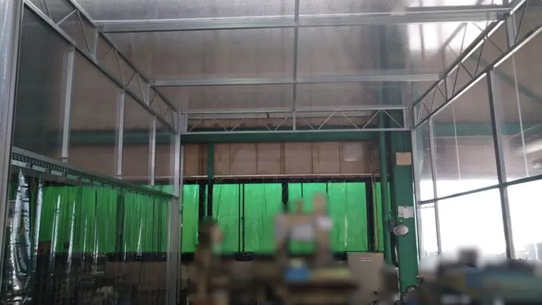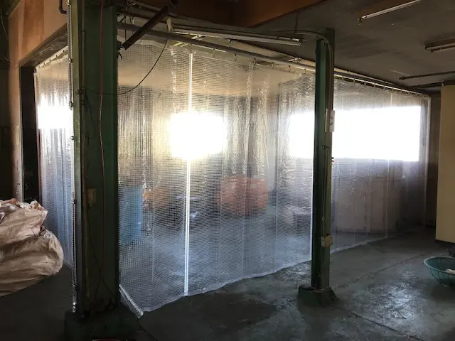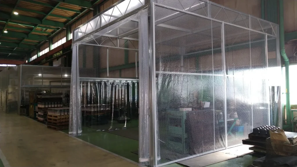 工場内の区画は、ビニールブース熱気・冷気・粉じんを遮断。作業環境を改善。低コスト・短納期
